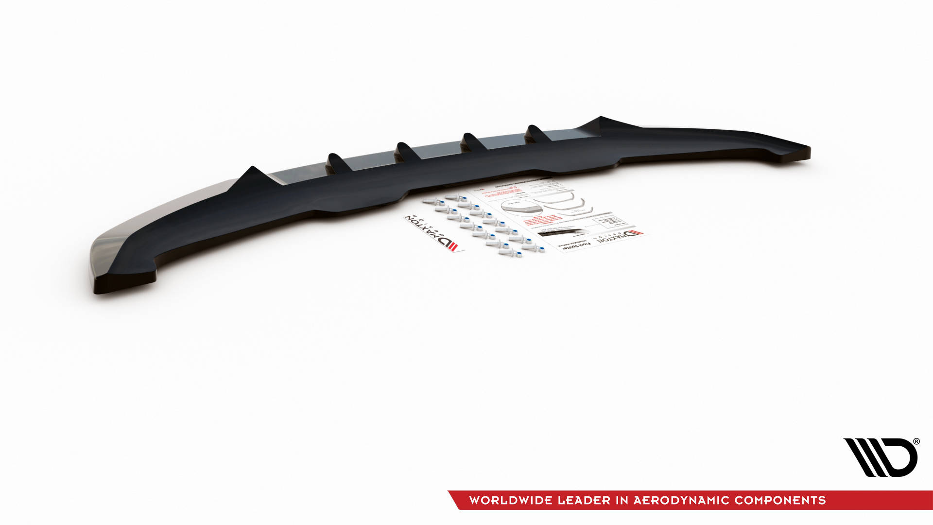 The design lowers the car visually, enhancing its dynamic profile while contributing to greater vehicle stability. The splitter is supplied in black and can be finished in another color if desired. Every set includes the splitter, mounting hardware, and detailed instructions, ensuring a precise and secure fit.