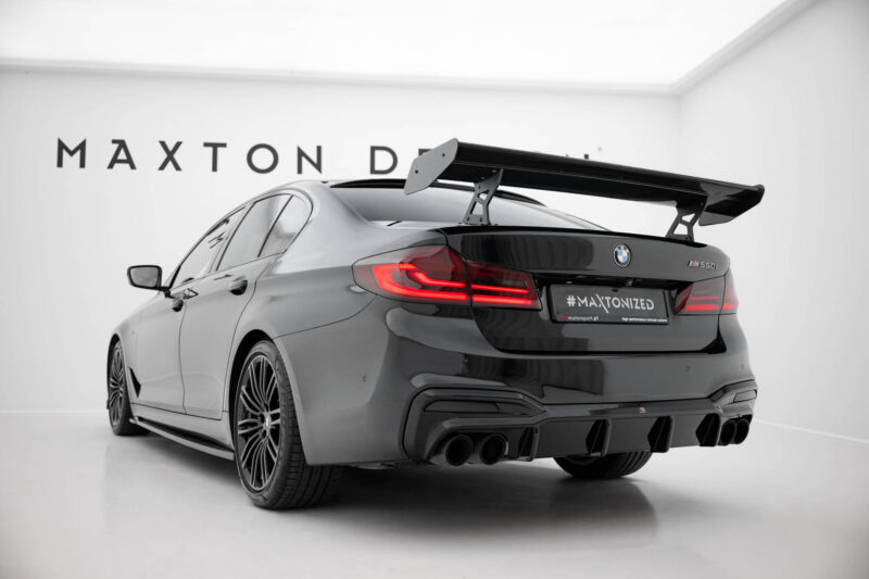The Maxton Design Prepreg Carbon Fibre Spoiler with Internal Brackets Uprights for the BMW 5 Series G30 and F90 M5 models is a high-performance aerodynamic upgrade that enhances both functionality and style. Manufactured using cutting-edge thermo-pressure technology, this spoiler directs airflow efficiently over the rear of the vehicle, improving stability and driving dynamics at high speeds. Constructed from high-quality prepreg carbon fibre, it offers unmatched strength and lightweight performance, perfect for those looking to enhance their car’s aerodynamics. The package includes the carbon wing spoiler, lower spoiler mounts, aluminum mounting brackets, and carbon wing end risers – all designed for a precise, durable fit. This spoiler doesn’t just look good; it’s engineered to perform under the most demanding conditions, making it a must-have for anyone who takes their driving seriously.