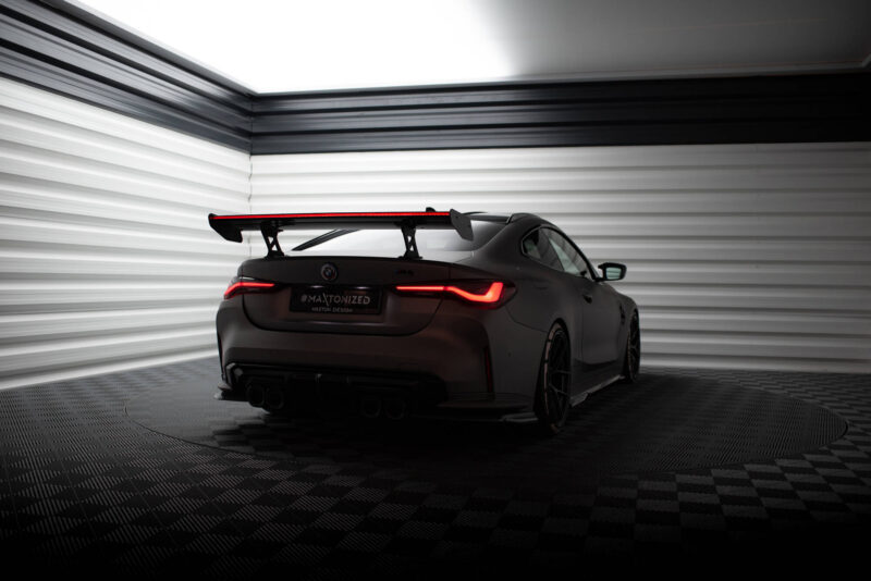 The Maxton Design Prepreg Carbon Fibre Spoiler with Internal Brackets Uprights offers precision engineering for BMW M4 G82, LCI, M440i, and G22 LCI models. This spoiler kit includes all necessary components for seamless installation, including carbon wing and lower spoiler mounts, aluminum brackets, and carbon end risers. Crafted from high-performance carbon fibre, this spoiler is not just about aesthetics; it enhances vehicle aerodynamics, improving airflow around the rear section of the car for greater stability at high speeds. The use of thermo-pressure technology ensures exceptional durability, while the lightweight nature of carbon fibre reduces overall vehicle weight. This is a must-have upgrade for those who demand the best in both design and performance.