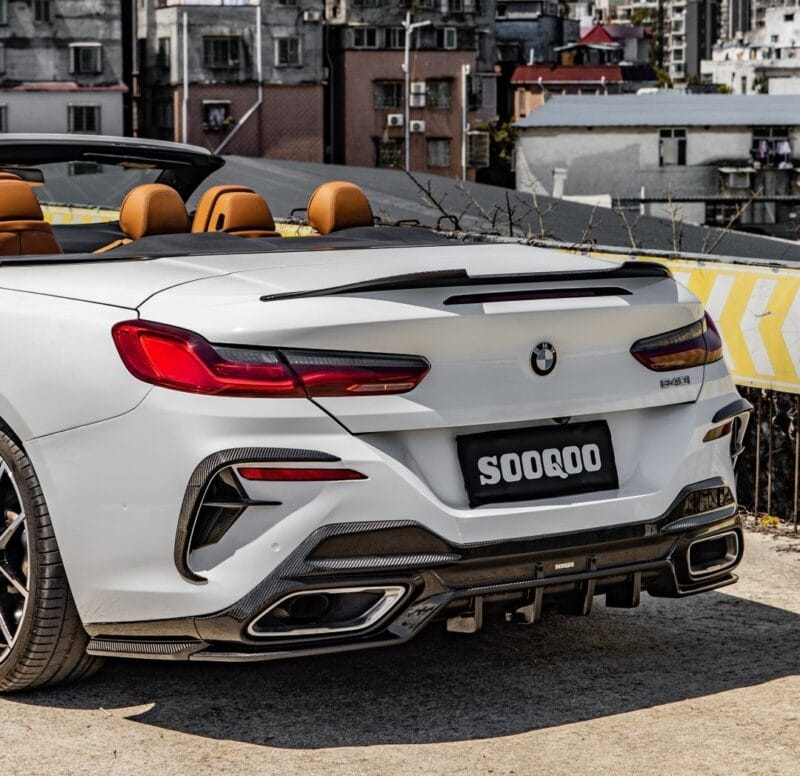 Upgrade your BMW 8 Series with the SOOQOO G14 G15 G16 Prepreg CARBON FIBRE Rear Bumper Outer Trims, designed to enhance the aesthetic appeal and sophistication of your G14, G15, or G16 models. These trims are meticulously crafted from high-quality prepreg carbon fibre, known for its exceptional strength and lightweight properties, ensuring both durability and a sleek finish. The trims fit seamlessly into the rear bumper of the BMW 8 Series, accentuating its elegant lines and sporty silhouette. This upgrade not only adds a touch of luxury but also contributes to the overall aerodynamics of the vehicle, subtly improving performance. Perfect for BMW 8 Series owners who value style and quality, the G14 G15 G16 Prepreg CARBON FIBRE Rear Bumper Outer Trims offer an outstanding way to customize your vehicle, making it uniquely yours while enhancing its grandeur and road presence.